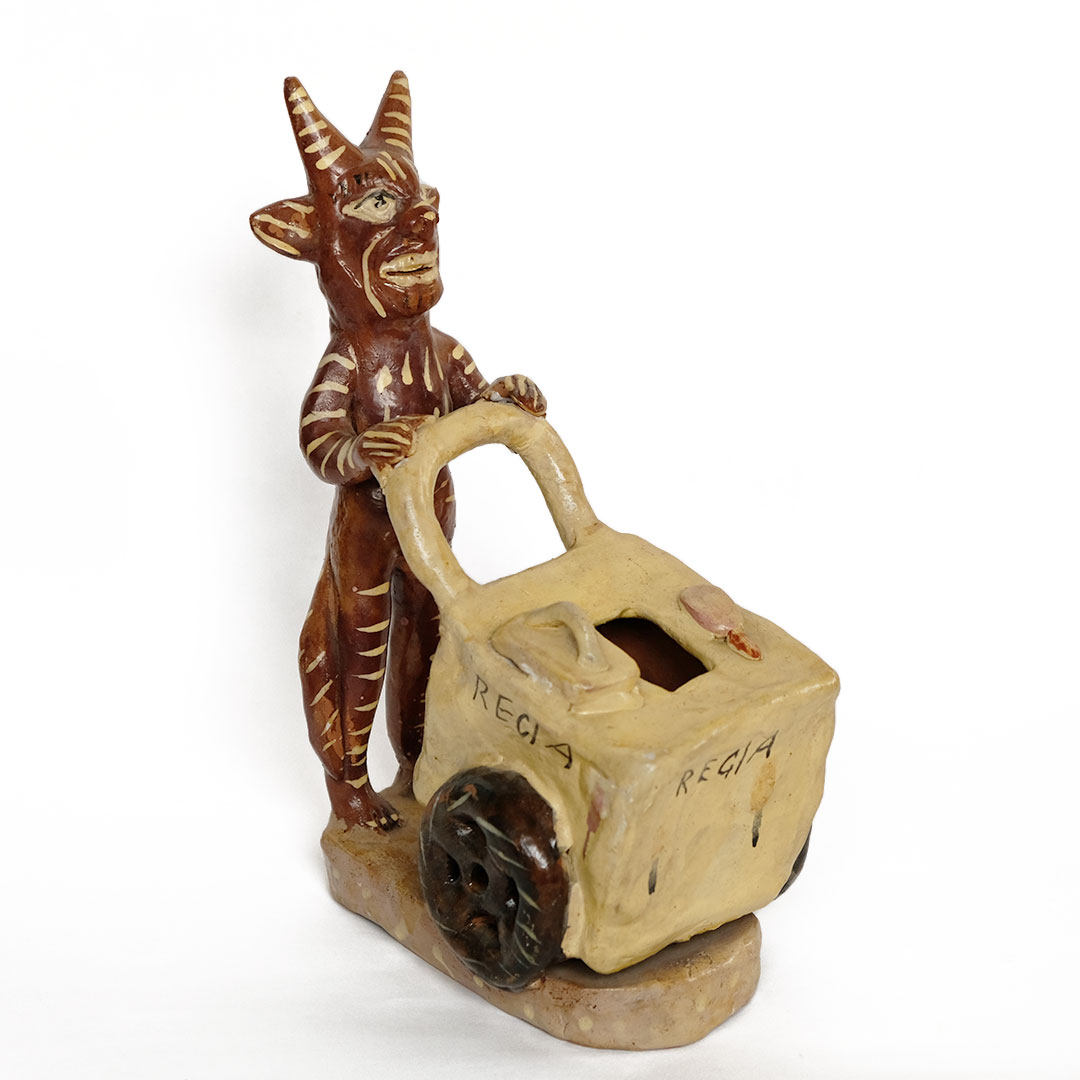 1980年代にミチョアカン州オクミーチョでつくられた「地獄のアイスクリームマン」。先住民プレペチャ族の村オクミーチョは、奇妙な陶人形の産地として、とくに悪魔をモチーフにした作品が多く作られていることで知られています。かつてはこの「地獄のアイスクリームマン」のようにニス塗りの作品が多く作られていましたが、現在は素焼きにアクリル絵具で彩色しただけの作品が多く、ニス仕上げの作品はほとんど作られていません。