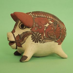 ゲレーロ州サン アグスティン オアパン村でつくられたブタ。綿を混ぜた土を手で成形し、表面をアイボリー色の土でコーティングしたあと、動物や植物の文様を土や石などの天然素材だけで描き、家畜の糞などを燃料に野焼きして作られます。数百年以上も前から行われているこの伝統的なやきもの作りを、現在でも続けているのはわずか4家族。その4家族のうちのひとつ、デ ラ クルース ファミリーの作品です。