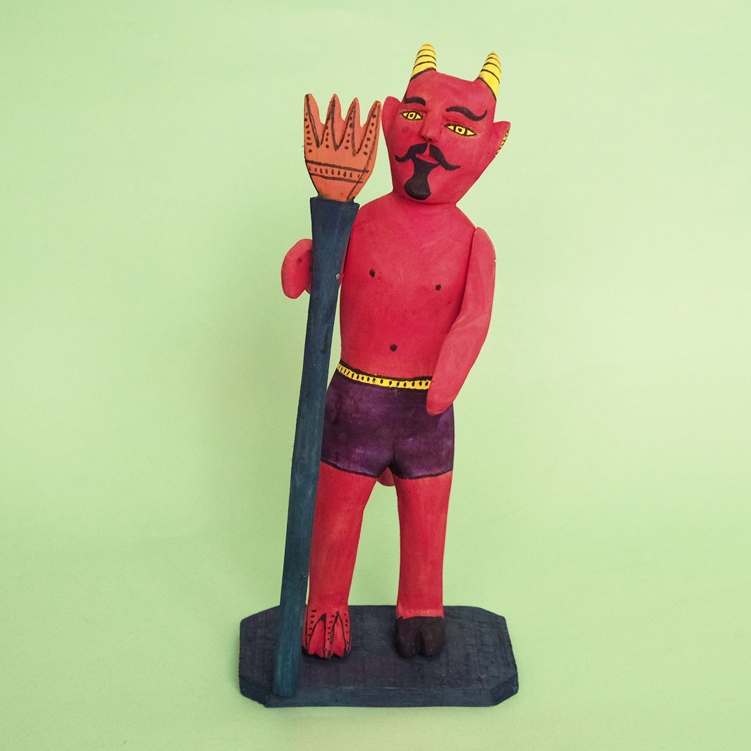 オアハカン ウッドカーヴィング(メキシコ・オアハカ州でつくられる木彫り)の悪魔。1970年代から木彫りを作り続けているオアハカ州某村のZファミリーの作品です。アニリン染料を使った彩色や素朴なつくりなど、製作方法は当時のまま。