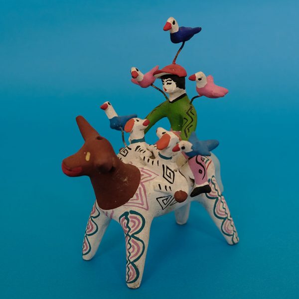 メキシコ民芸の黄金時代を代表する陶芸家のひとり、プエブラ州アカトラン デ オソリオのエロン マルティネス(1918-1990)が1970年代に製作した「少年と牛」。人や動物を積み重ねるスタイルは彼の代表的な作風。白地に幾何学模様が描かれる彩色も代表的な作風のひとつです。