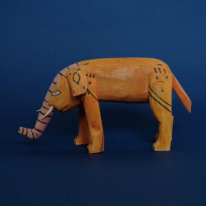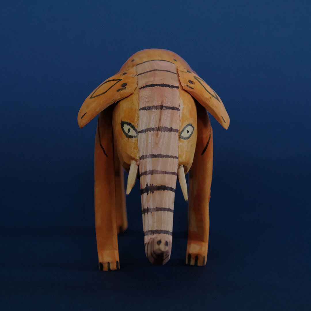 1980年代後半に作られたオアハカン ウッドカーヴィング(メキシコ・オアハカ州でつくられる木彫り)のゾウ。産地はオアハカ州ラ ウニオン テハラパン村。作者はサンティアーゴ ファミリーのうちのひとり。ただ、オリジナル サンティアーゴ5兄弟ではなく、レイナルド サンティアーゴ、マキシミーノ サンティアーゴなどの第2世代の作品だと思われます。
