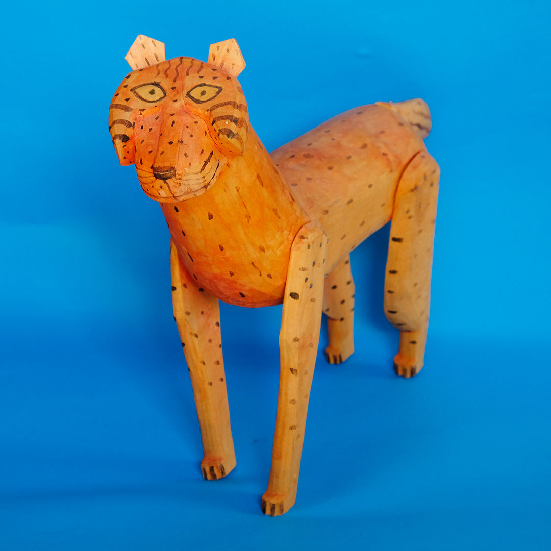 1980年代につくられたオアハカン ウッドカーヴィング(メキシコ・オアハカ州でつくられる木彫り)の山猫。高34センチ、尻尾を含めた体長46センチの大きな作品です。作者は、1968年に木彫り製作をはじめたオアハカン ウッド カーヴィング最初期の職人のひとり、キリーノ サンティアーゴ(1937- )。キリーノ サンティアーゴは今でも製作を続けていますが、作品の平均サイズは20センチほど。このように大きな作品は20年以上前につくらなくなりました。