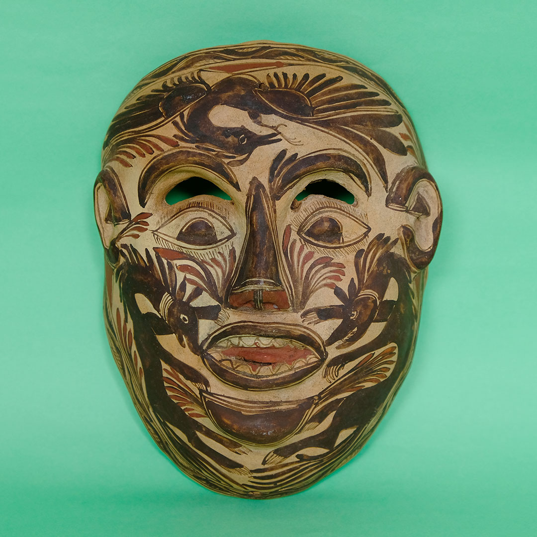 1960年代にゲレーロ州でつくられた仮面。数百年以上も前からアステカ系の先住民ナワ族がつくり続ける伝統的なやきものです。綿を混ぜた土を成形して、表面をアイボリー色の土でコーティングし、その上に動物や植物の文様を土や石などの天然素材だけで描き、家畜の糞などを燃料に野焼きしてつくられます。