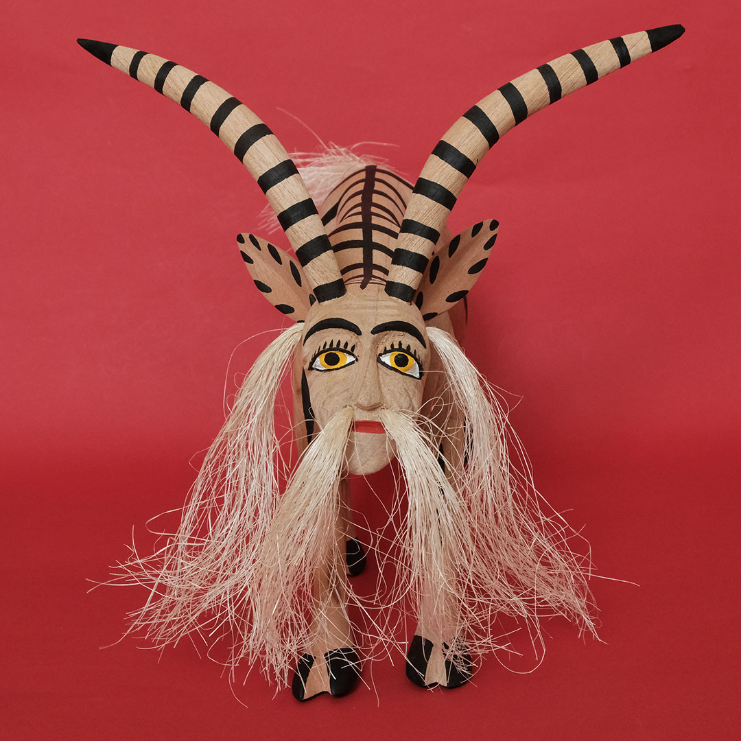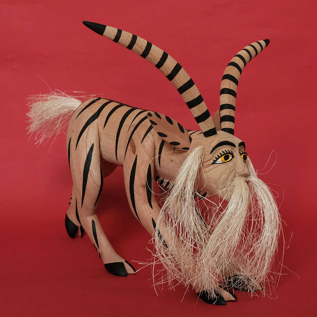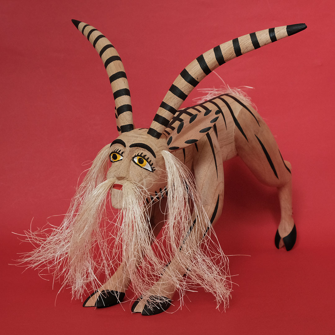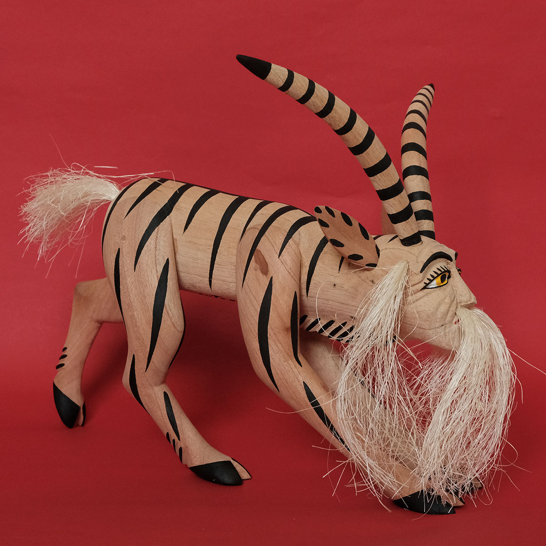 オアハカン ウッド カーヴィング(メキシコ・オアハカ州でつくられる木彫り)の創始者マヌエル ヒメネス(1919-2005)の息子、イサイーアス ヒメネス(1961-)作のヤギのナワール。これぞヒメネス スタイルというべき造形の見事さは、10代の頃から父マヌエルの作品製作を手伝ってきたイサイーアスならでは。