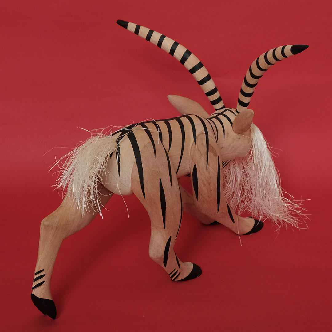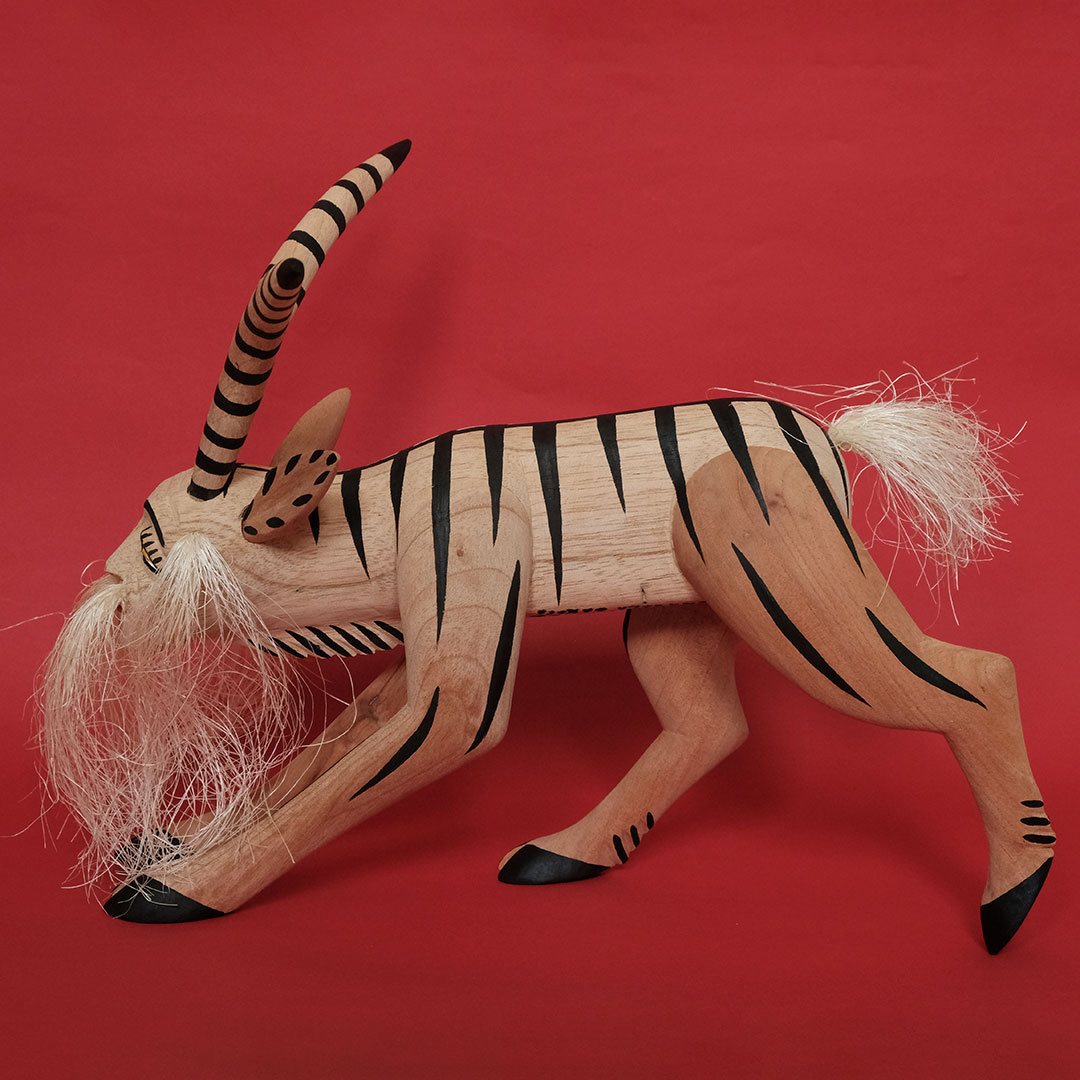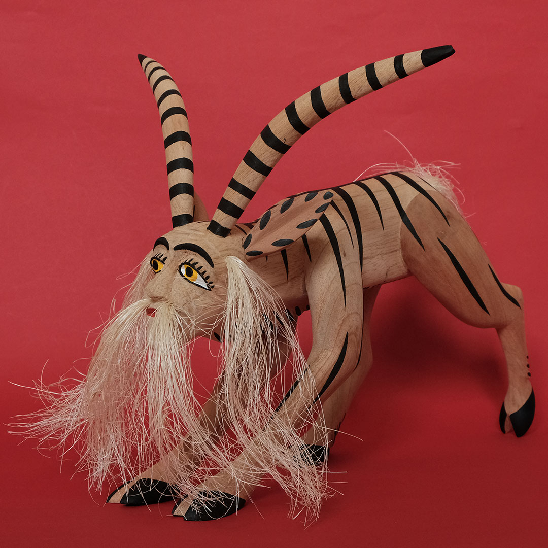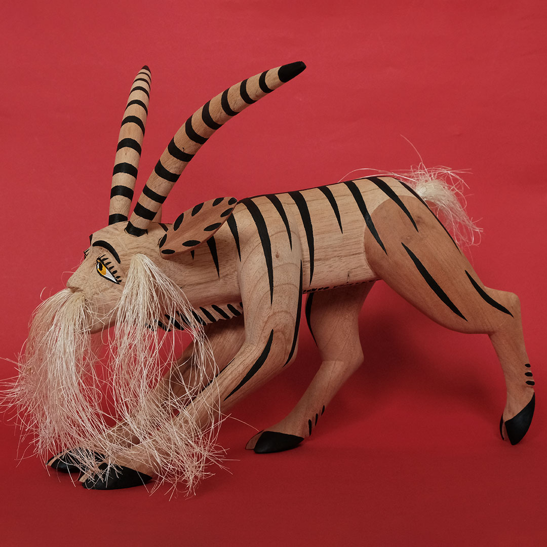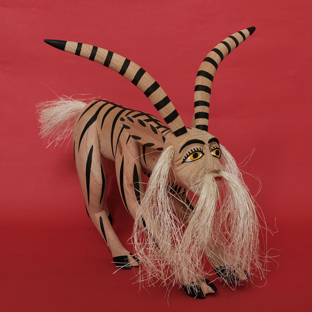 オアハカン ウッド カーヴィング(メキシコ・オアハカ州でつくられる木彫り)の創始者マヌエル ヒメネス(1919-2005)の息子、イサイーアス ヒメネス(1961-)作のヤギのナワール。これぞヒメネス スタイルというべき造形の見事さは、10代の頃から父マヌエルの作品製作を手伝ってきたイサイーアスならでは。